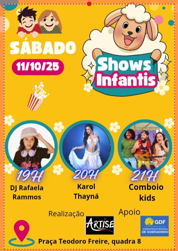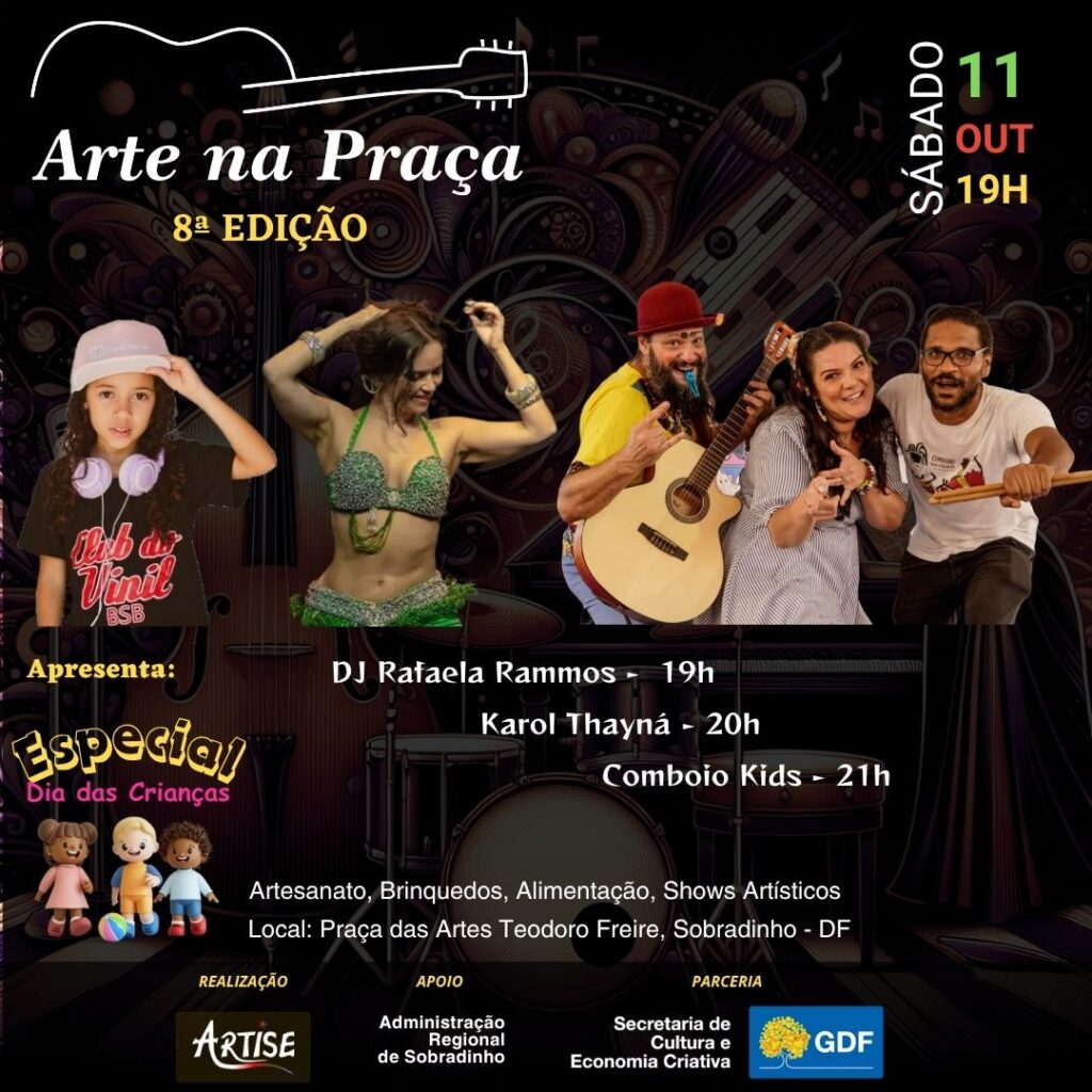 A criançada de Sobradinho e região vai comemorar o dia das crianças com uma grande festa na Praça das Artes Teodoro Freire, na Quadra 8 da cidade serrana. No próximo sábado (11), a partir das 18h, o Arte na Praça preparou um show especial para animar a galerinha e toda a família.