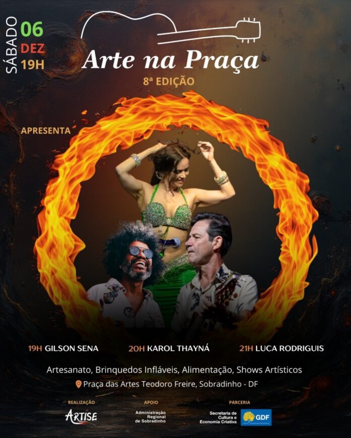 O Projeto Arte na Praça realiza neste sábado, 06 de dezembro, a 11ª noite de shows  desta edição, na Praça das Artes (Quadra 8), a partir das 19h. O evento promete atrair grande público com a apresentação de dois grandes nomes da música local: Luca Rodriguis e Gilson Sena.