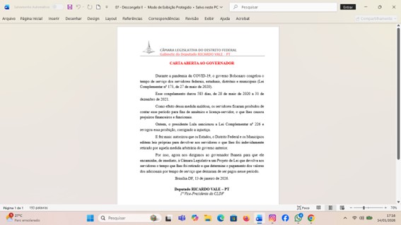 O vice-presidente da Câmara Legislativa do Distrito Federal, deputado Ricardo Vale, enviou uma carta aberta ao governador Ibaneis Rocha solicitando o encaminhamento imediato à CLDF de um Projeto de Lei que devolva aos servidores públicos do DF o tempo de serviço e os adicionais que deixaram de ser pagos durante a pandemia da COVID-19.