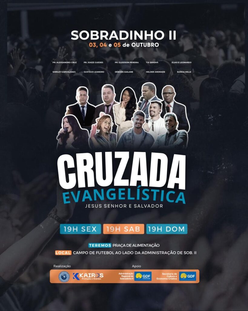 Nos dias 3, 4 e 5 de outubro, a Cruzada Evangelística Jesus Salvador e Senhor movimenta a cena cultural e religiosa do Distrito Federal com uma programação gratuita que promete emocionar diferentes gerações. Com entrada gratuita, o evento acontece em Sobradinho, reunindo artistas locais e nacionais, contação de histórias para crianças, palestras e uma praça de alimentação com opções de gastronomia para todos os gostos.