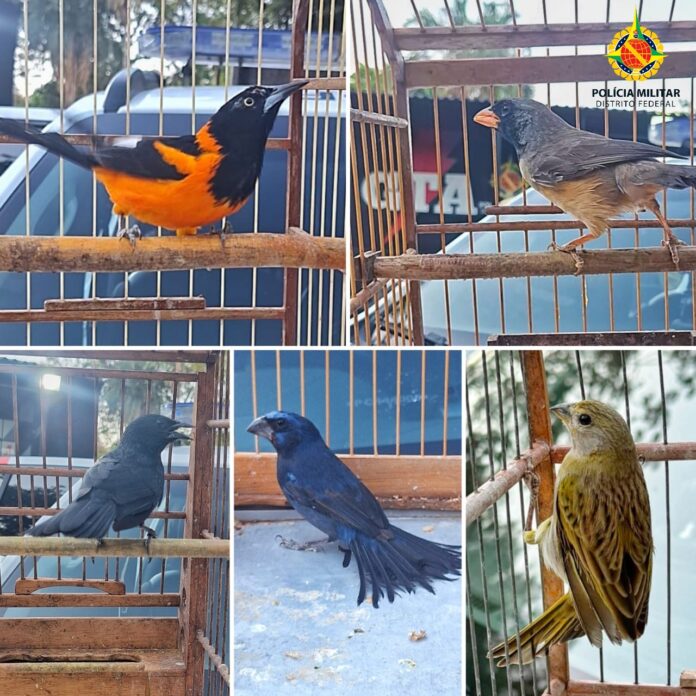 A Polícia Militar do Distrito Federal, por meio do Grupo Tático Ambiental (GTA) do Batalhão de Polícia Militar Ambiental (BPMA), no dia 27/09/2025, durante patrulhamento no Engenho Velho, região administrativa da Fercal, identificou uma gaiola com alçapão fixada em uma árvore em frente a uma residência.