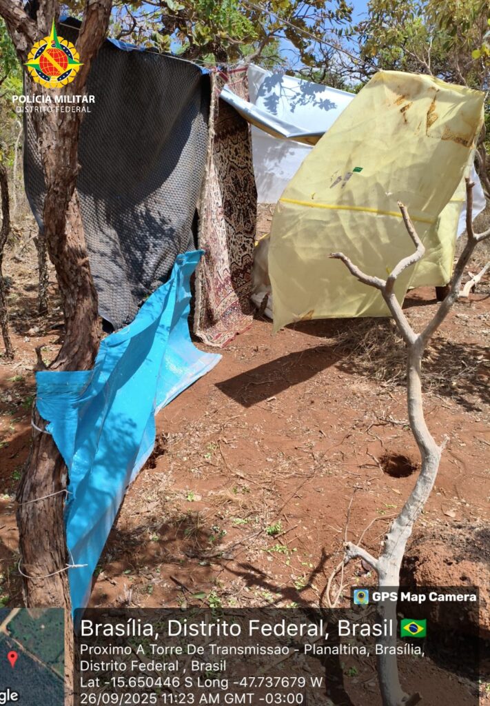 Na manhã desta sexta-feira (26/09/2025), por volta das 11h15, a Polícia Militar do Distrito Federal, por meio do Grupamento de Operações no Cerrado (GOC) do Batalhão de Polícia Militar Ambiental, realizou patrulhamento no Córrego do Arrozal, em atendimento a denúncia de parcelamento irregular do solo, supressão de vegetação e invasão de terra pública pertencente à Embrapa Cerrados.