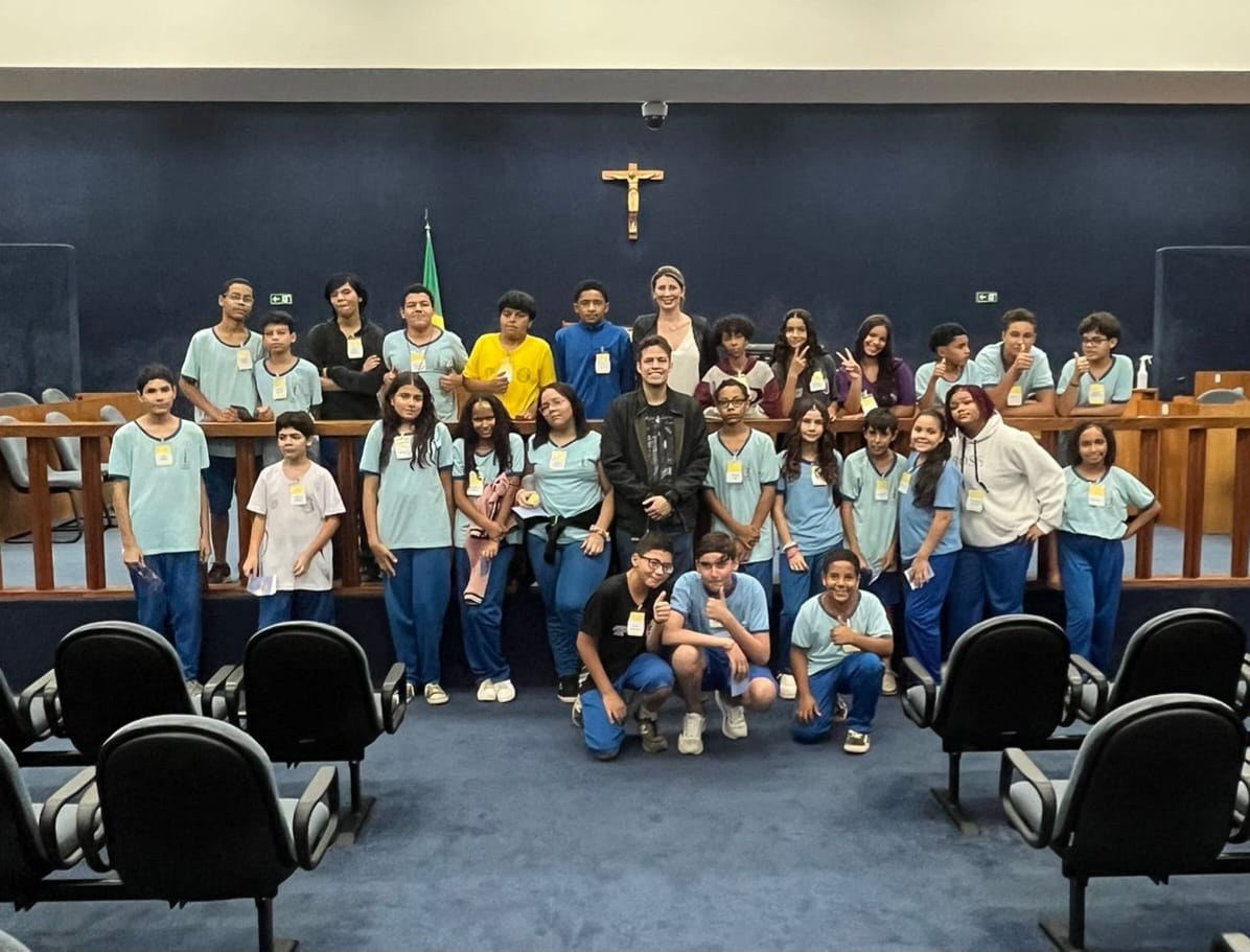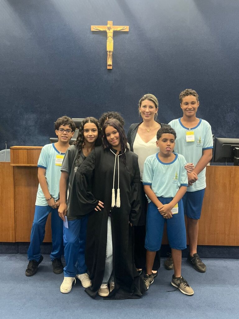 Após o bate-papo, os alunos assistiram a um divertido vídeo sobre os direitos das crianças e dos adolescentes e  participaram  da simulação de uma audiência de conciliação, momento de grande interação e participação.