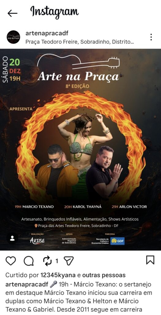A Quadra 8 de Sobradinho se prepara para receber um dos eventos mais aguardados da temporada. No próximo sábado, 20 de dezembro, o projeto ARTE NA PRAÇA chega à sua 13ª noite promovendo uma verdadeira imersão na cultura sertaneja.